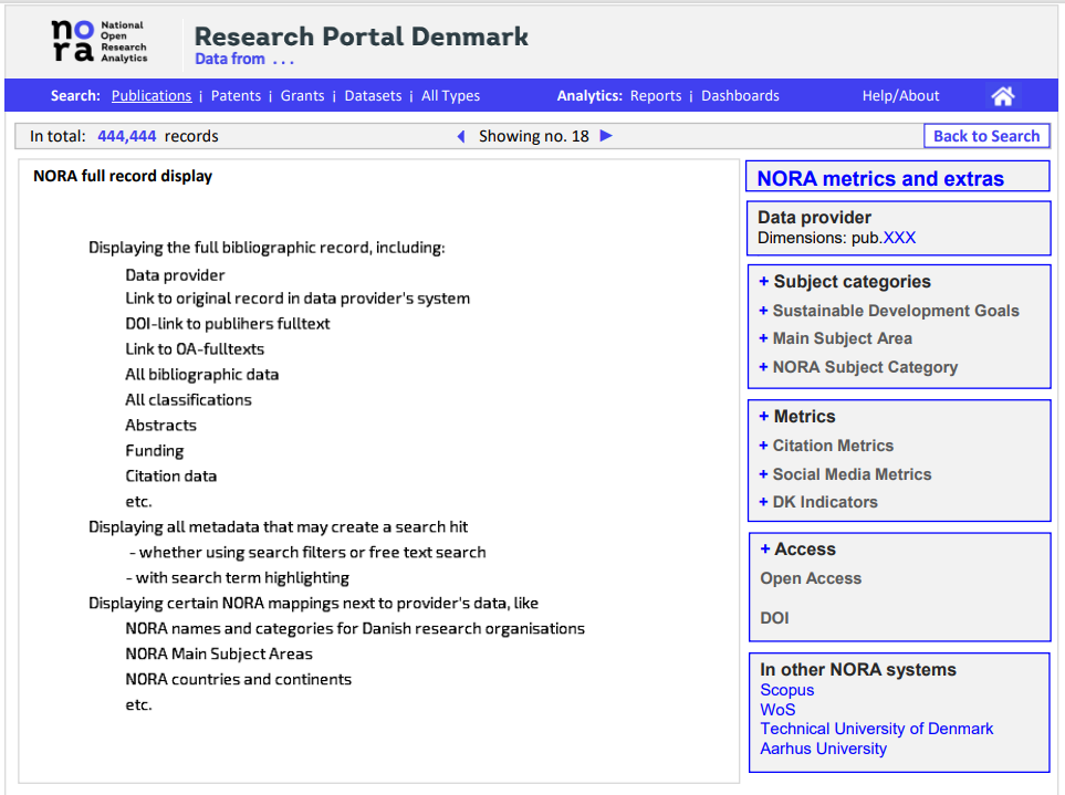 NORA, National Open Research Analytics, is a national initiative to enable robust and open insights and analytics of Danish research. NORA is focused on national level insights, and thus NORA supplements rather than replaces existing institutional systems, offering deep and detailed insights at various levels inside the institution, and existing global databases and research intelligence systems, offering insights and advanced analytics at the global level.